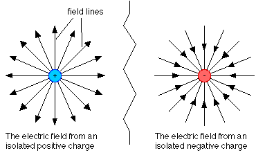 An alternative picture of an electric field is shown below. The lines are called electric field lines. The direction of the field at any point is the tangent drawn to the field line at that point. The strength of the electric field is indicated by the spacing between the lines. The field is strong where the lines are close together. It is weaker where the lines are spaced farther apart. Remember that electric fields exist in three dimensions.